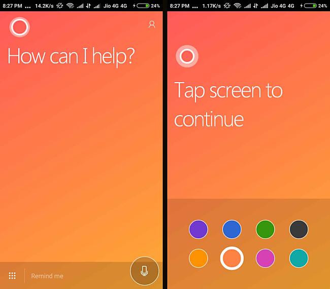 - Now choose your favorite color for Cortana Screen & tap anywhere on the screen to continue.
